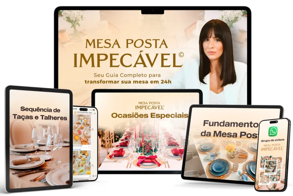 O Mesa Posta Impecável é um programa completo de 7 dias desenvolvido para transformar sua experiência como anfitriã, através de técnicas simples e práticas de mesa posta. Não é um curso teórico, mas sim um método prático que ensina você a criar mesas elegantes com o que já tem em casa.